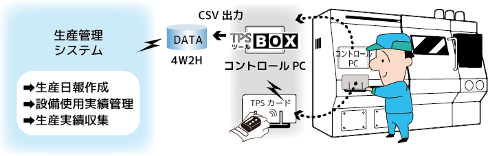TPSツールBOX(コントロールPC)から実績データ(4W2H)をCSV出力し、業務システムでレポート作成、実績管理を行う。