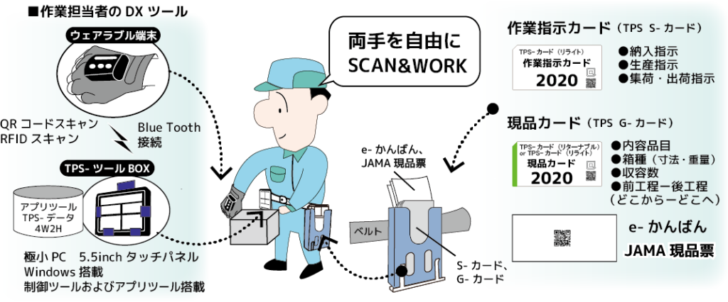 かんばん・現品票・現品カードと指示書(S-カード)はTPSカードBOXに入れてベルトにつけてウェアラブル端末を使ってSCAN&WORK